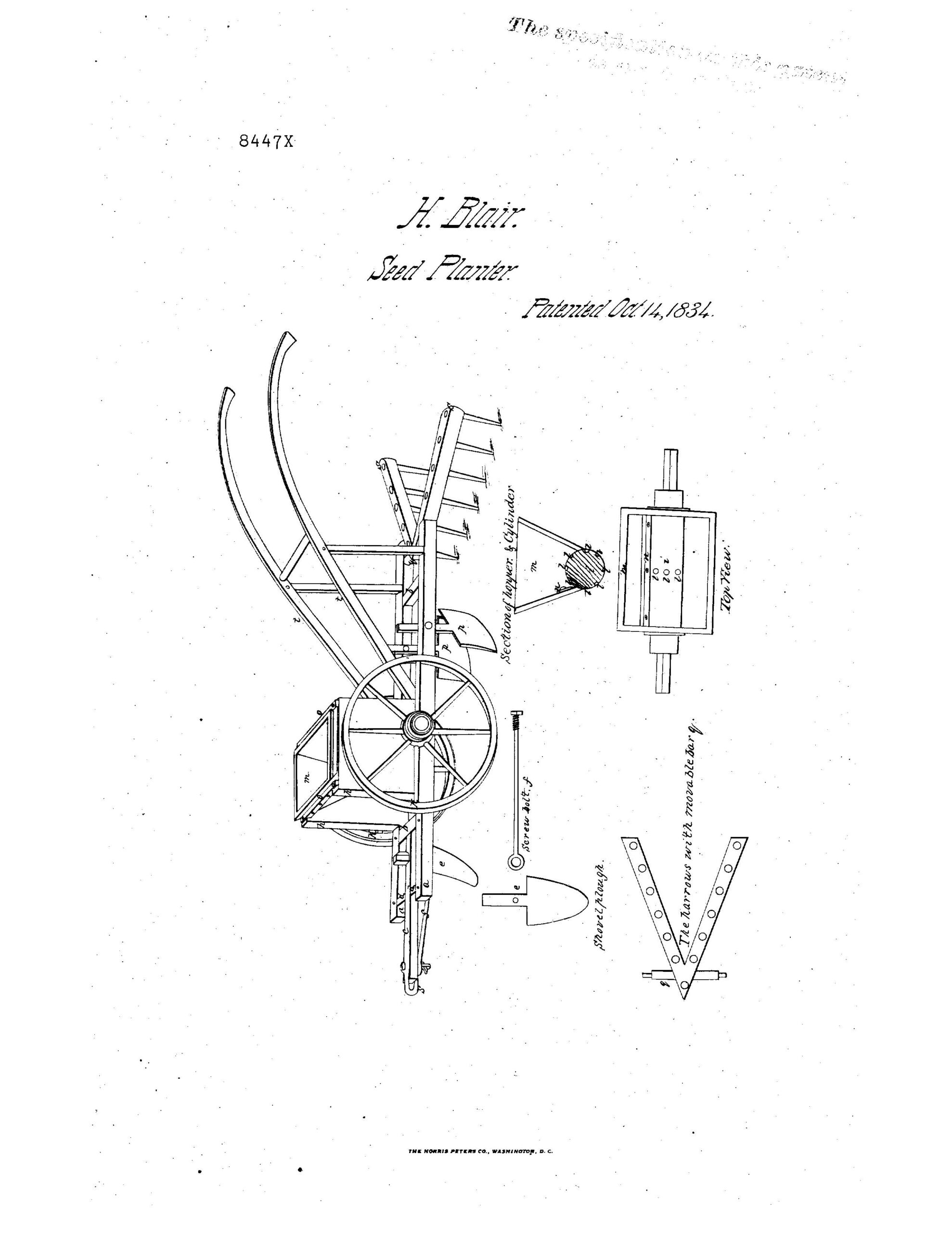 The second patent that issued to a black inventor was U.S. Patent No. 8447X, issued to Henry Blair on a (Corn) Seed Planter. He also received U.S. Patent No. 15 on a Corn Planter.