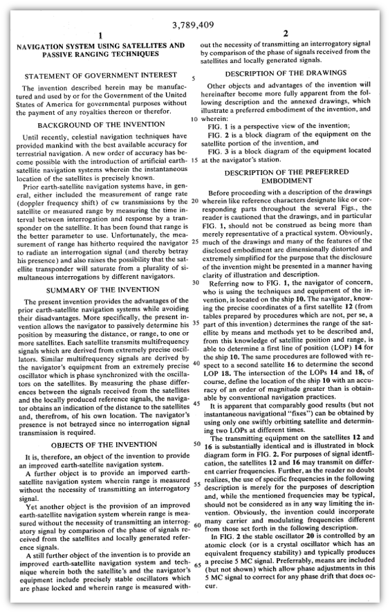 The claims are the name of the game in a patent infringement analysis. The claims are generally located at the end of the patent, which comes after the patent’s front page, drawings, and written description. Take as an example U.S. Patent No. 3,789,409 that issued in 1974 to Roger L. Easton, who has been dubbed the “Father of GPS.”[2] The front page of Easton’s ‘409 Patent is excerpted below.