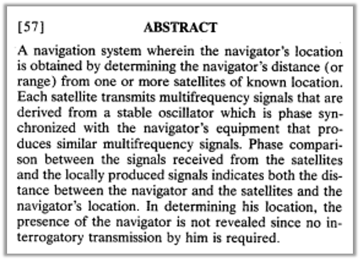 Titles. Take again as an example Easton’s ’409 Patent. Easton’s ‘409 Patent is titled “Navigation System Using Satellites and Passive Ranging Techniques” (excepted below).